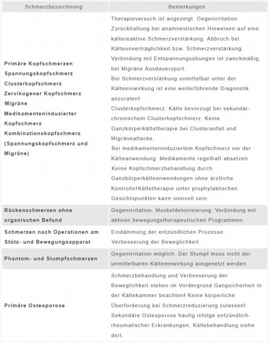 Bei unterschiedlichen Schmerzsyndromen wird die Druckschmerzschwelle durch die Ganzkörperkältetherapie signifikant erhöht (22). Der chronische Schmerz kann bis zu drei Monate anhaltend (in Einzelfällen auch länger) aufgehoben, bzw. reduziert sein (19, 27). Auch bei schwer therapierbaren neuropathischen Schmerzsyndromen (z.B. Phantomschmerz) kann die Ganzkörperkälteanwendung eine Therapieoption sein (53).