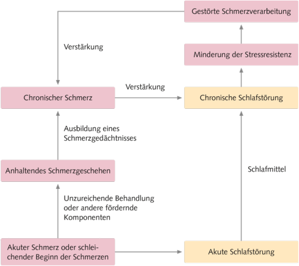 Diese Schlafstörung ist prinzipiell nach den gleichen Kriterien charakterisiert wie die primäre Insomnie, auch gleicht sie dieser in der Symptomatik, die Ursachen sind allerdings in dem chronischen Schmerzgeschehen -begründet. Sie tritt als Folgeerscheinung einer organischen Erkrankung auf. Unzureichende Schmerzbehandlung und falsche oder keine Behandlung der beginnenden Schlafstörung sind leider häufig die Komponenten, die das Geschehen chronifizieren, mit negativen Rückwirkungen auf das Schmerzgeschehen (Abbildung 4.10). Die schmerzlindernde Wirkung der Ganzkörperkälte steht im Vordergrund der Behandlung. Oft bessert sich dann schon nach wenigen Behandlungen mit dem Rückgang der Schmerzen auch der Schlaf. ,,Seit Monaten habe ich das erste Mal wieder gut geschlafen“ – so lautet dann der einfache und befreiende Ausdruck gebesserten Befindens.