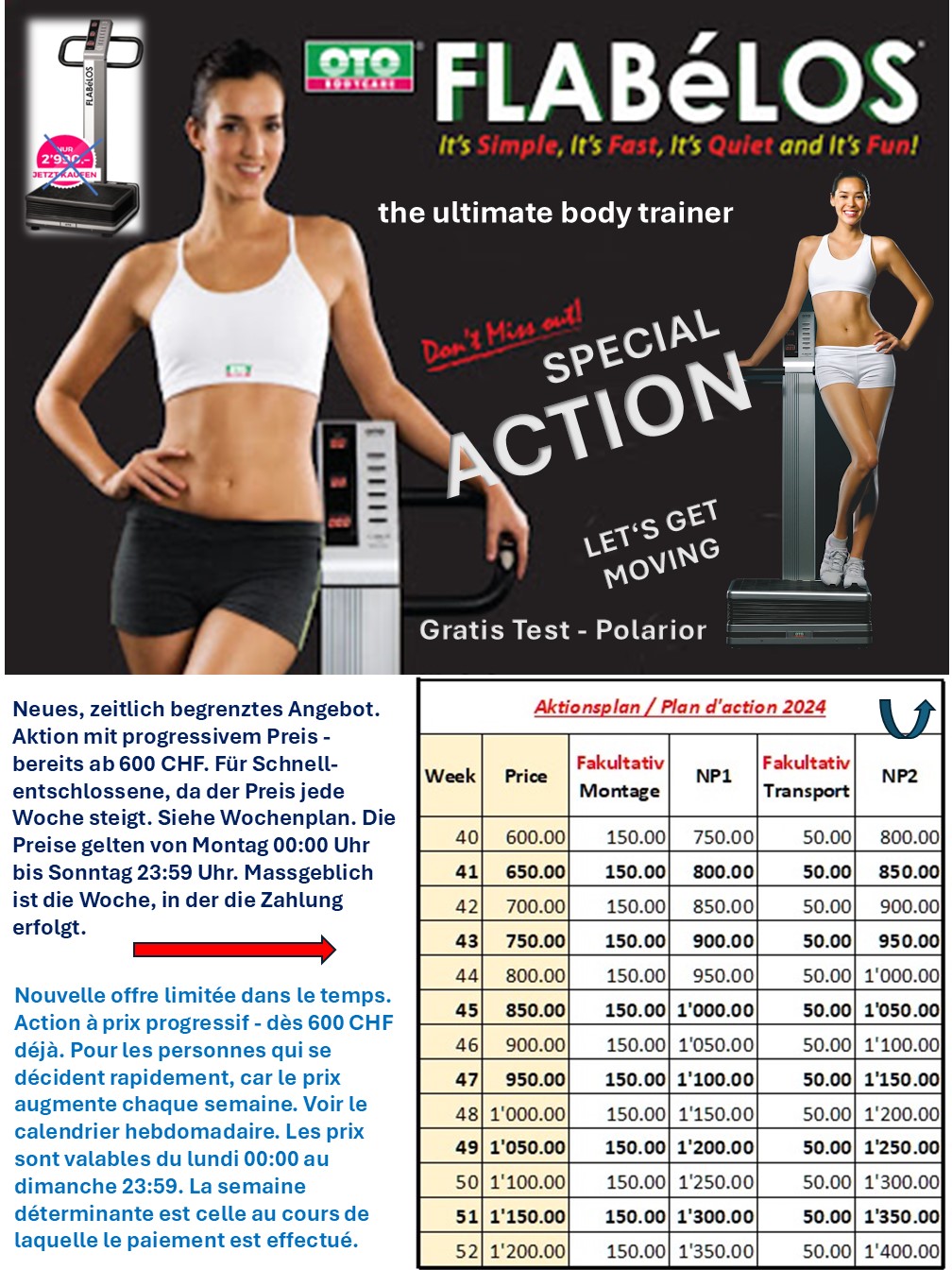 Im Gegensatz zu vielen anderen Fitnessgeräten und medizinischen Vibrationsgeräten ist der FLABéLOS zum unschlagbaren Preis von CHF 2990.- erhältlich. Das Gerät benötigt zudem nur 60 x 60 cm Platz – und damit viel weniger als andere Vibrationsplatten.
